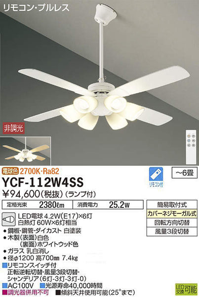 DAIKO 大光電機 CF TYPE 羽径1200mm 吊下パイプ400mm ファン+灯具+パイプ シルバーサテン [LED電球色][パイプ吊下 傾斜天井・吹き抜け天井対応] YCF-112S4SS