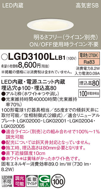 LGD3100LLB1 パナソニック 明るさフリー(ライコン別売) 100形 Φ100 LEDベースダウンライト [電球色][拡散]