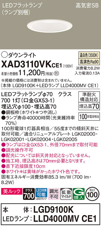 XAD3110VKCE1 パナソニック 100形 Φ100 LEDフラットランプ ベースダウンライト[温白色][拡散]